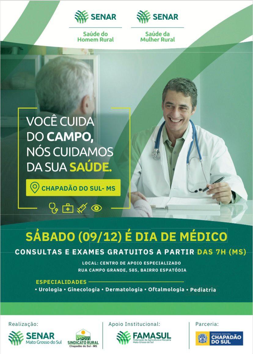 O Executivo Municipal através da Secretaria Municipal de Saúde em parceria do Senar/MS, Sindicato Rural e Famasul estará ofertando gratuitamente neste sábado, 09, a partir das 07h, consultas e exames para toda população, com as seguintes especialidades: